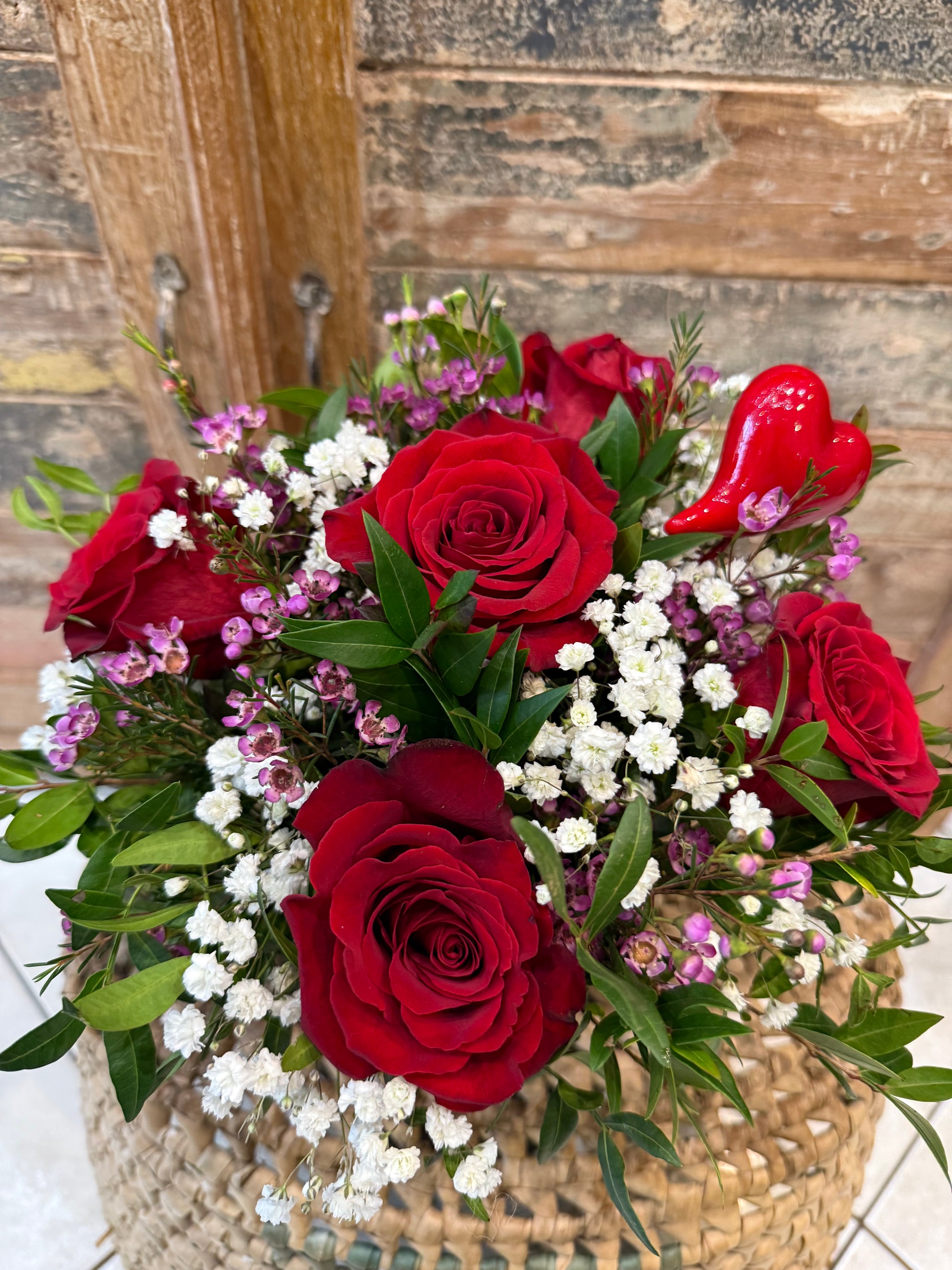 Votre Valentin ou Valentine n'a pas de vase ? Aucun problème, optez pour cette composition piquée dans la mousse florale aux couleurs de l'amour. Elle est composée de roses rouges "Freedom", de wax rose, de gypsophile, de son petit cœur d'amoureux et de feuillage.